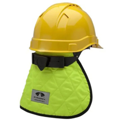 - Helmeinlage mit Nackenschirm, aus gestepptem, leuchtfarbenem Textilmaterial, inwendig gefüttert mit blauem PVA Material, welches einen nachhaltigen Kühlungseffekt bei hohen Umgebungstemperaturen im Innen und Aussenbereich bietet.